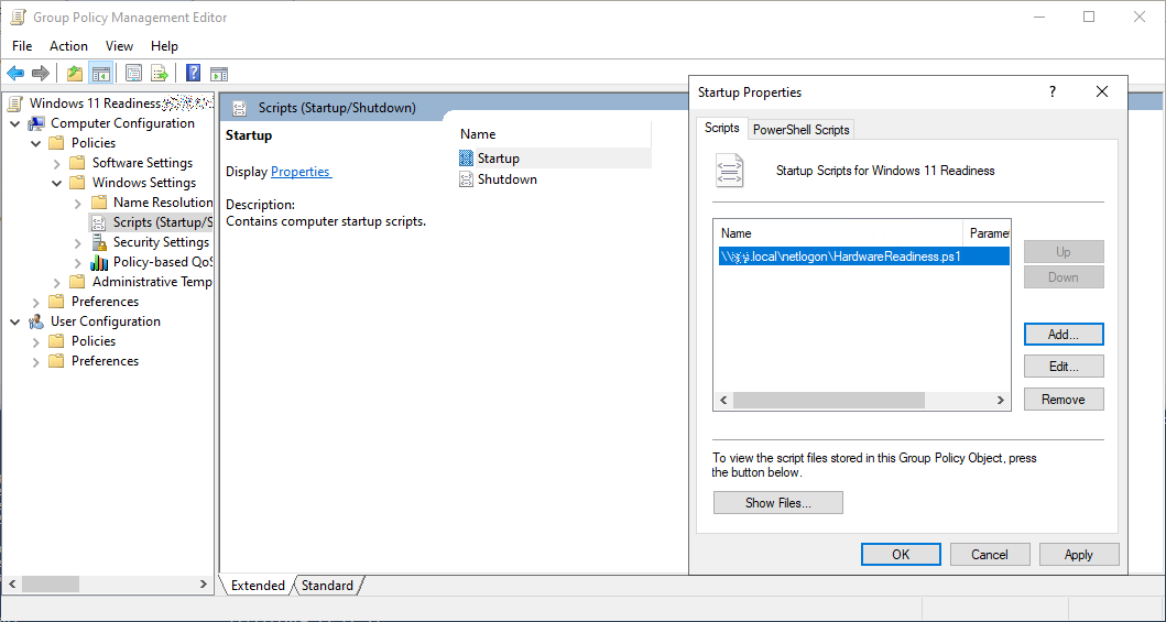 - Navigate to Computer Configuration > Policies > Windows Settings > Scripts (Startup / Shutdown) > Startup > (tab) PowerShell Scripts.