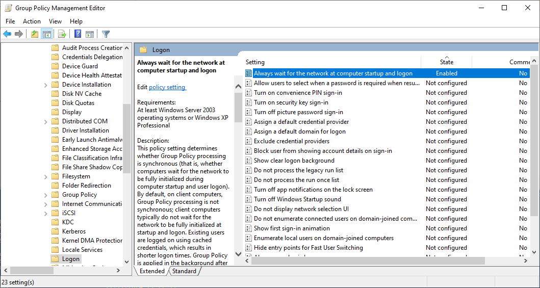Navigate to Computer Configuration > Administrative Templates > System > Logon.