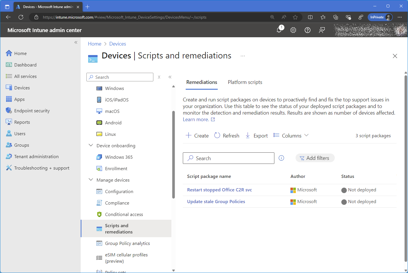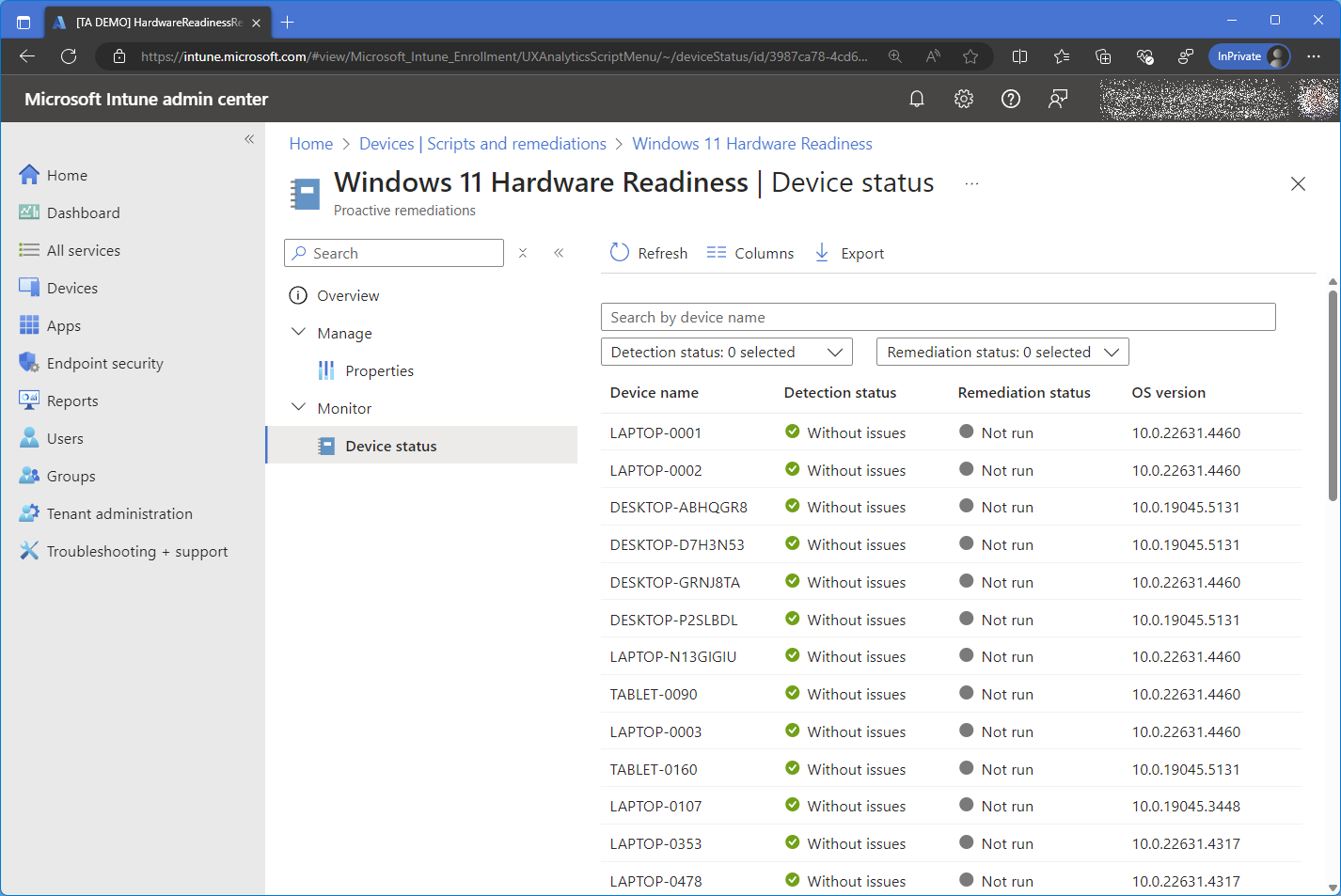 Note: you require a license to be able to run remediation scripts. If you don't have the required licenses, then you will need to use the output from one of the built-in Intune "Endpoint Analytics" reports instead.