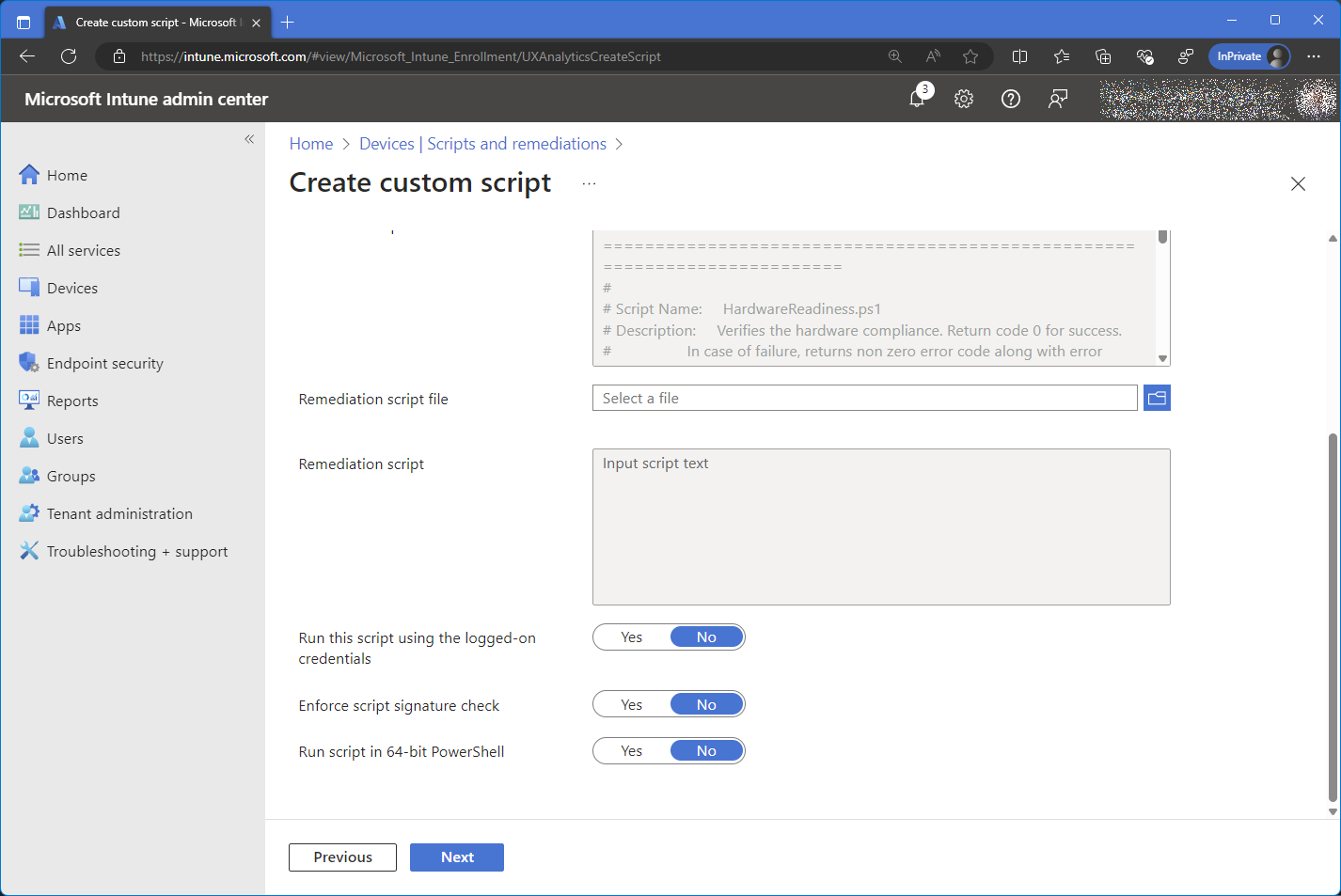 On the Remediations tab choose the option + Create to deploy Microsoft's Hardware Readiness script.
