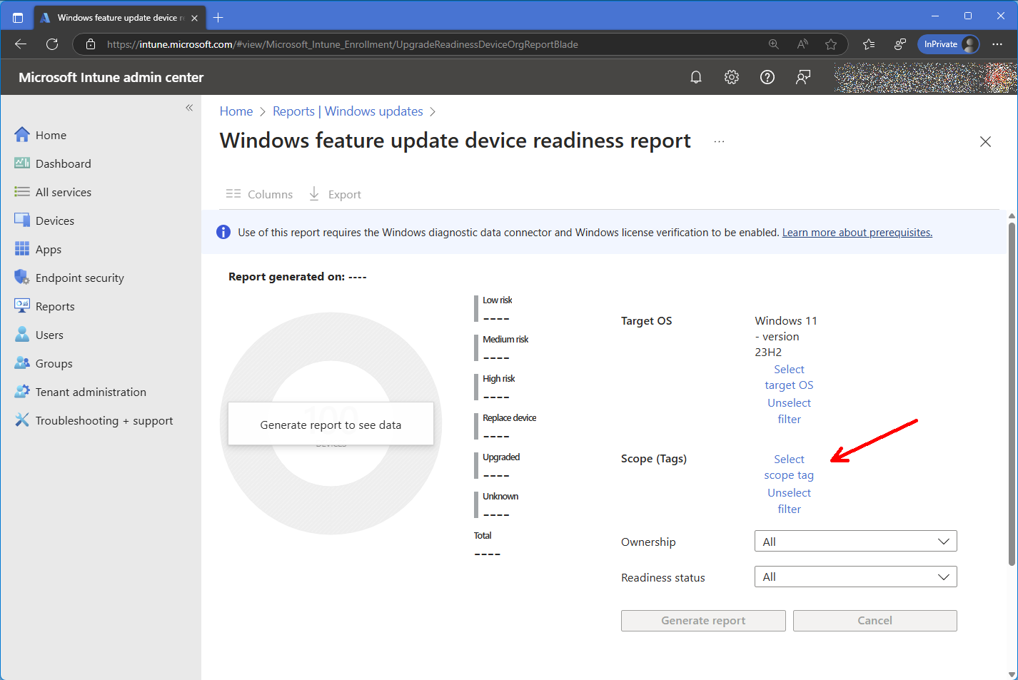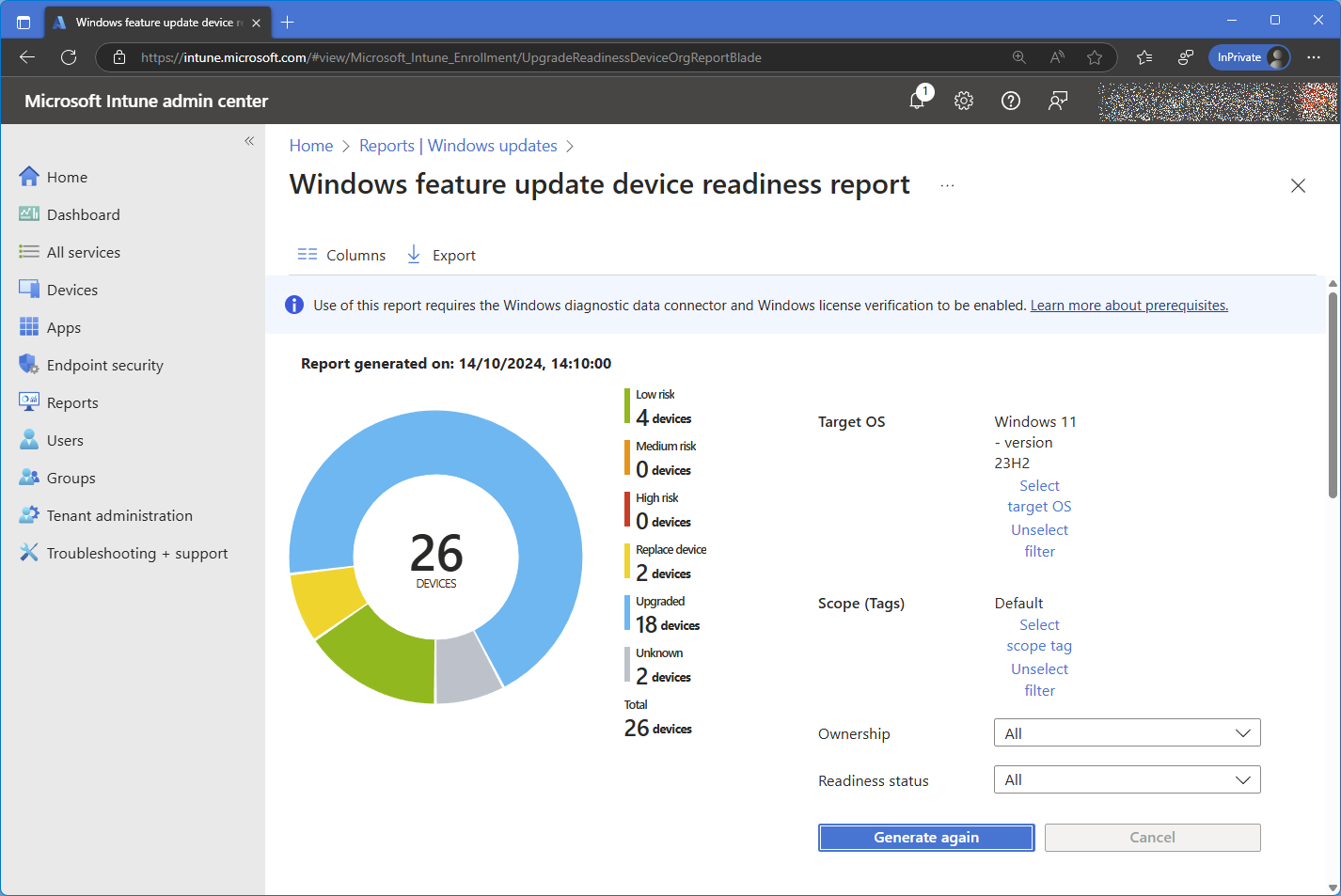 To use Intune's Windows Feature Update Device Readiness Report, your devices must be managed by Intune, co-managed, or have the Configuration Manager client version 2107 or newer with tenant attach enabled. To be included in the reports, devices have Windows diagnostic data enabled at the "Required" level or higher. Also, Windows Health Monitoring must be configured to include Windows Updates as part of the scope.