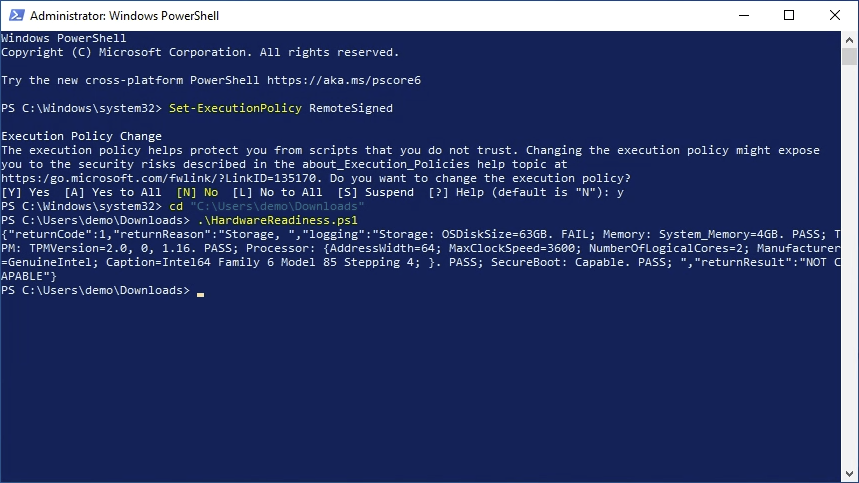 - Download Microsoft's Hardware Readiness script from https://aka.ms/HWReadinessScript.