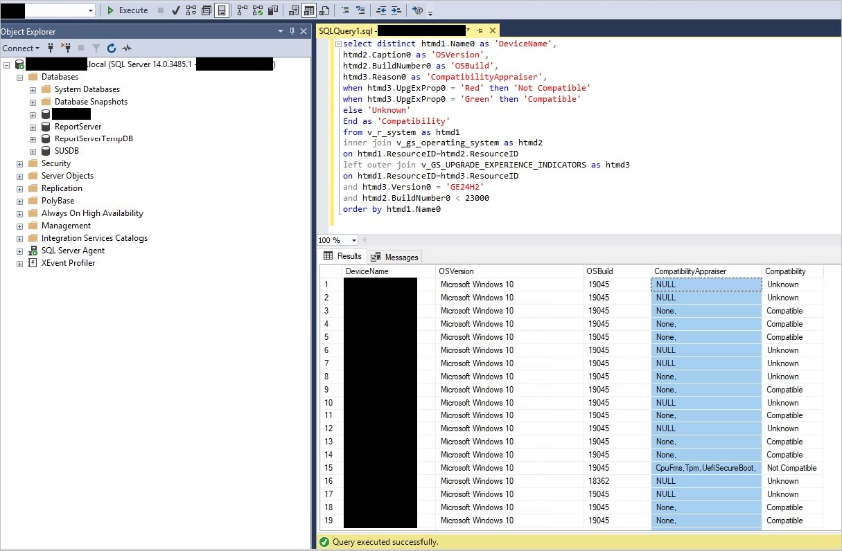 To ensure your devices are reporting to SCCM, your devices must have telemetry data set to at least “1” or Basic (see Computer Configuration\Administrative Templates\Windows Components\Data Collection And Preview Builds\Allow Telemetry). Please also ensure the Microsoft Endpoint Configuration Manager (MECM) client has been upgraded to the latest version and that the “Microsoft Compatibility Appraiser” scheduled task has been configured to run (\Microsoft\Windows\Application Experience).